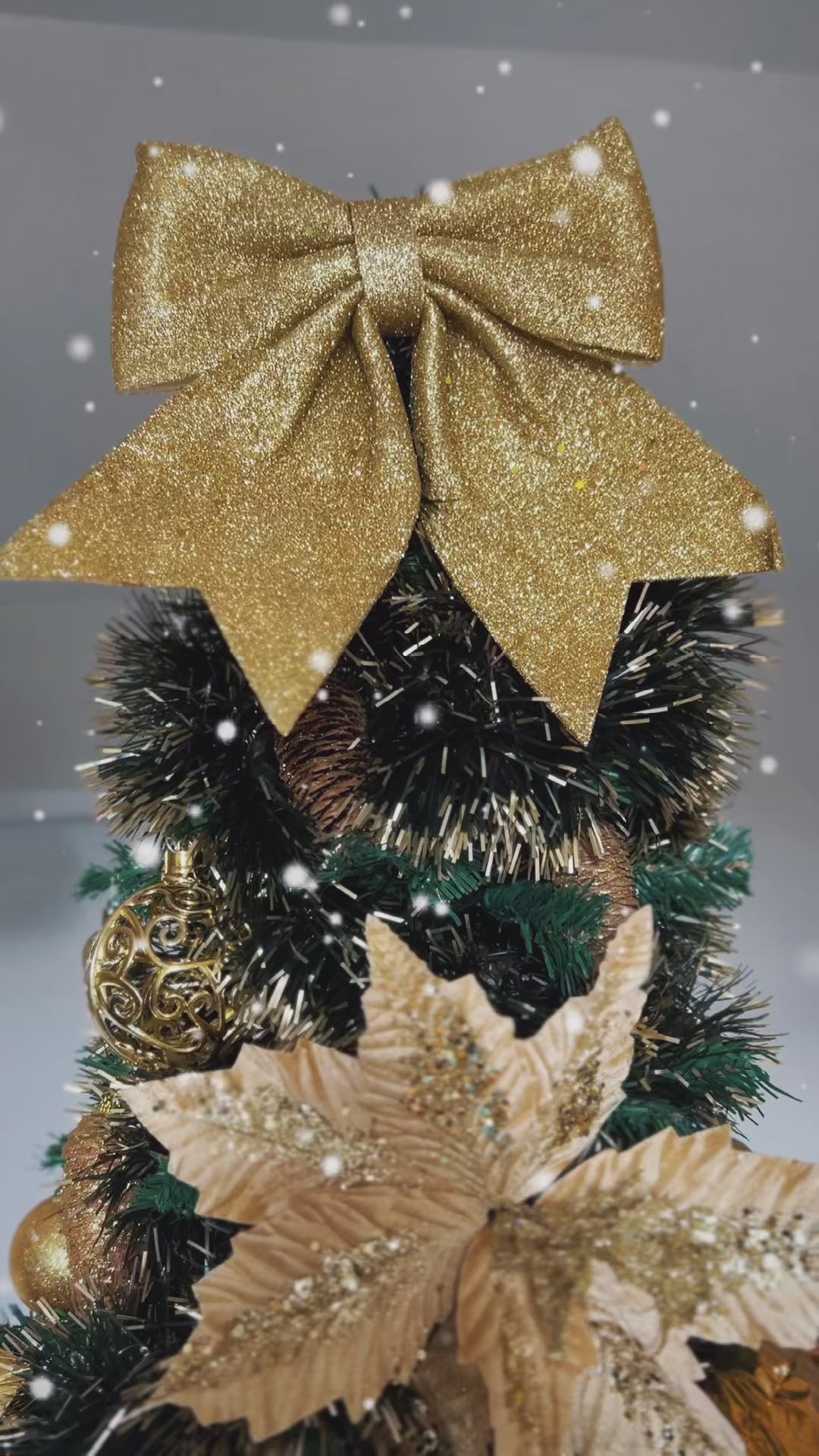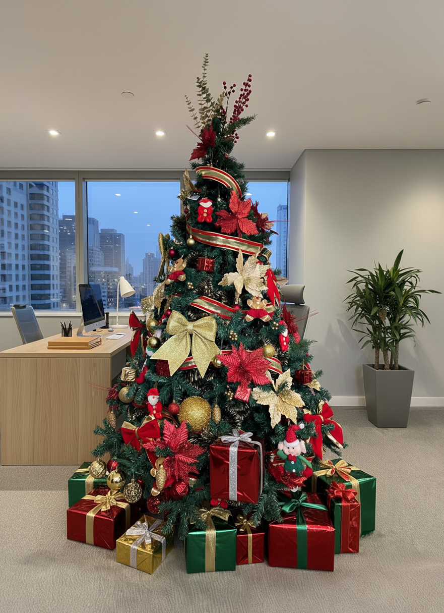 3️⃣ Recebe o Kit completo: Árvore + enfeites combinados + laços + flores + luzes como brinde.