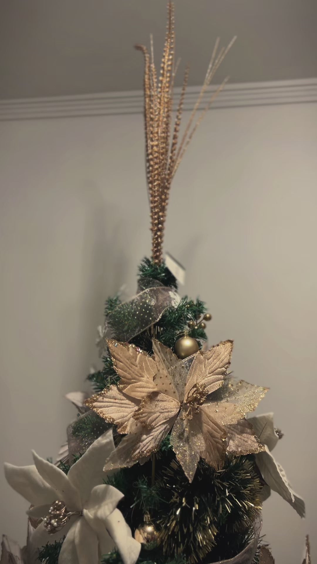 Cada detalhe foi cuidadosamente escolhido — flores em veludo, fitas delicadamente trabalhadas, pendentes refinados e bolas com acabamento texturizado, em glitter e brilho perolado — criando uma atmosfera natalina clássica, acolhedora e luxuosa.